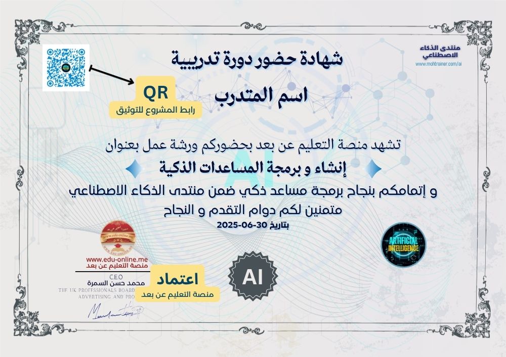 الآن نقدم مكافأة خاصة لك! **🎁 تسجيل مخفض في برنامج "إنشاء وبرمجة المساعدات الذكية - المصغر"** لتطوير مهاراتك في **هندسة الأوامر** وبناء مساعدات ذكية متقدمة، حيث ستتعلم أحدث التقنيات وتنضم لمجتمع المطورين المحترفين!
